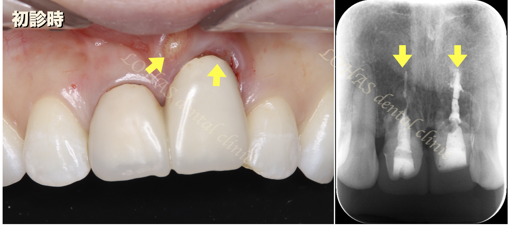 上顎の前歯2本は昔に外傷で、神経を取っており、差し歯になっていました。その歯の再治療は今までにも何回か繰り返していたそうなのですが、レントゲンではやはり歯を残しての治療は難しい状態でした。